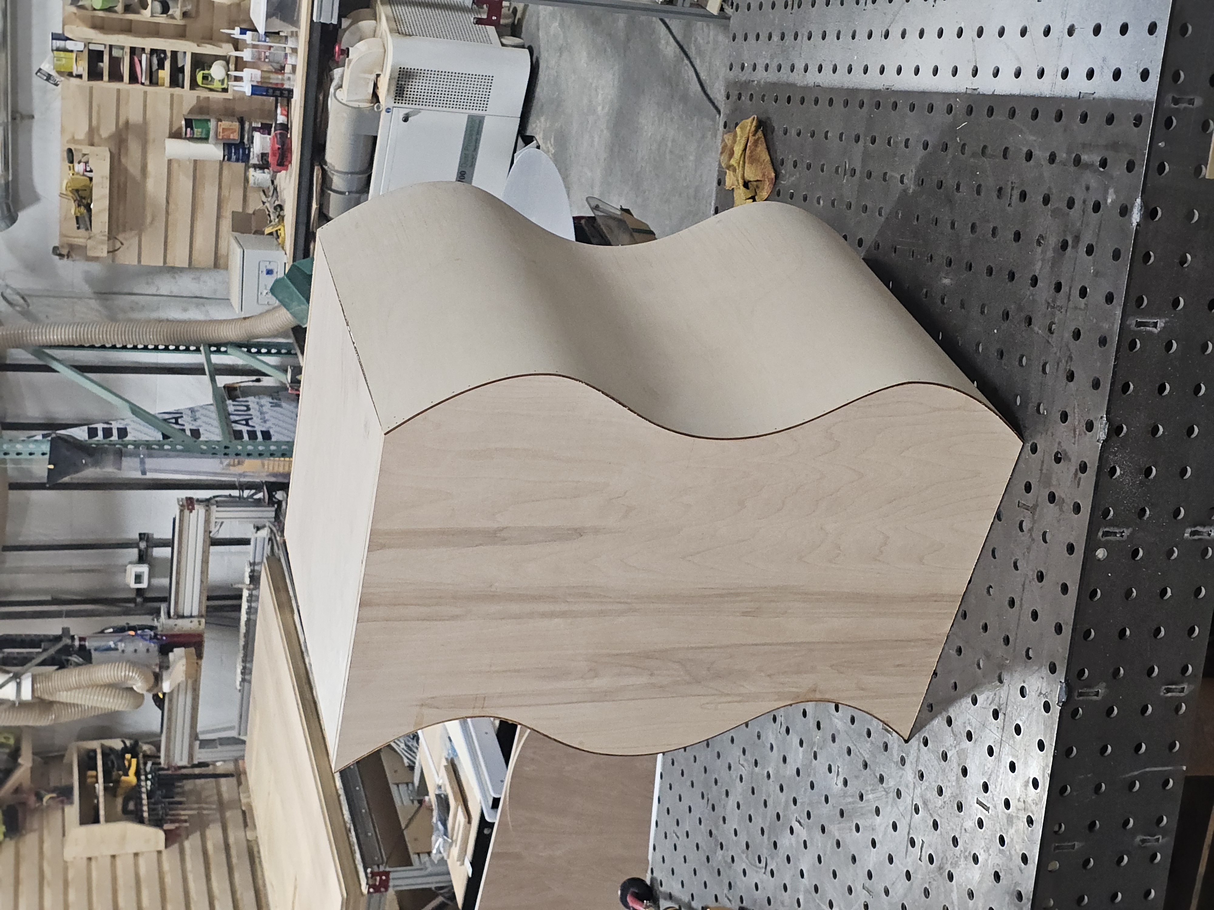 This wooden wave pedestal has a table top the size of 20"x20" and sits 32" tall.