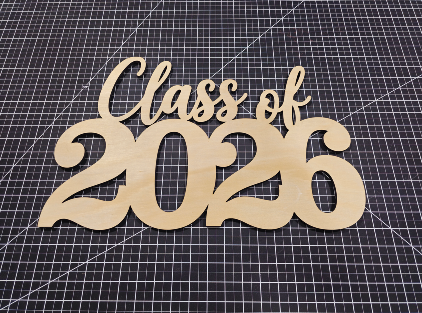 This Class of 2026 wooden sign has been laser cut out of 1/4" birch and is ready to hang at a graduation party. The face is snaded enough to allow you to apply a coat of spray paint on it.